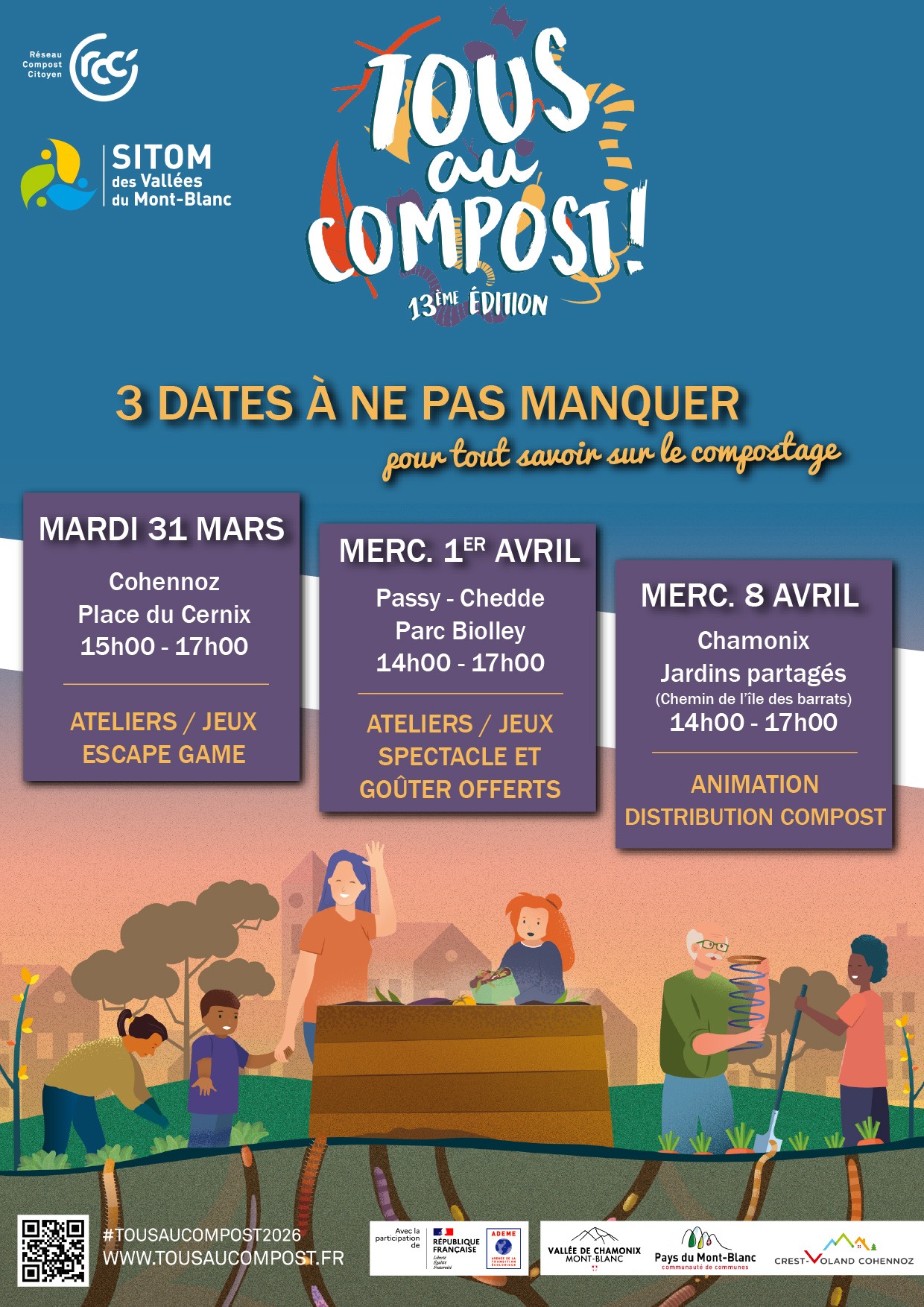 Dans le cadre de l’opération nationale « Tous au compost » qui se déroulera du 28 mars au 12 avril, le SITOM organise des événements à destination du grand public. Ces rendez-vous ont pour objectif de sensibiliser les habitants aux enjeux du compostage et de la valorisation des biodéchets, tout en proposant des temps d’échange et de convivialité accessibles à tous.